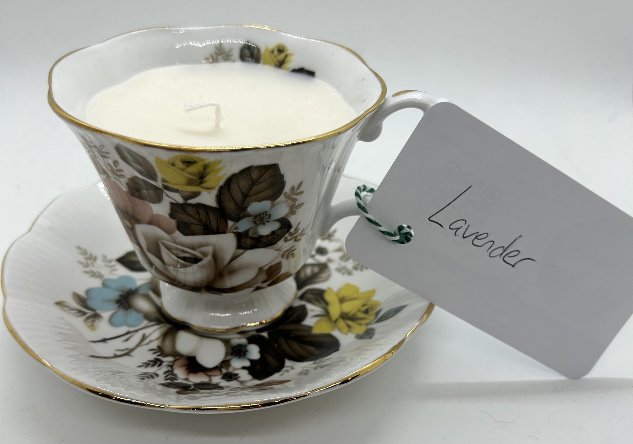 Vintage teacup containing a wax candle